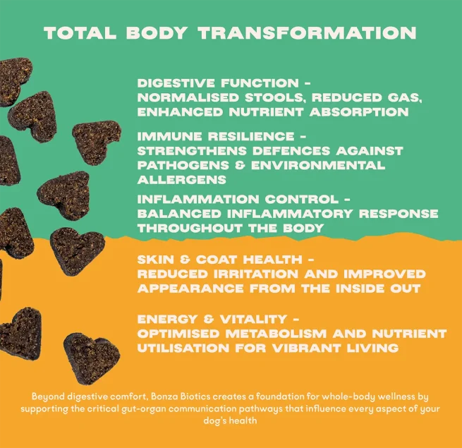 Bioactive Bites Biotics formule voedt het kritieke darmmicrobioom dat de wetenschap nu erkent als het commandocentrum voor de algehele gezondheid van je hond, en beรฏnvloedt alles van spijsvertering en immuniteit tot stemming en orgaanfunctie.
